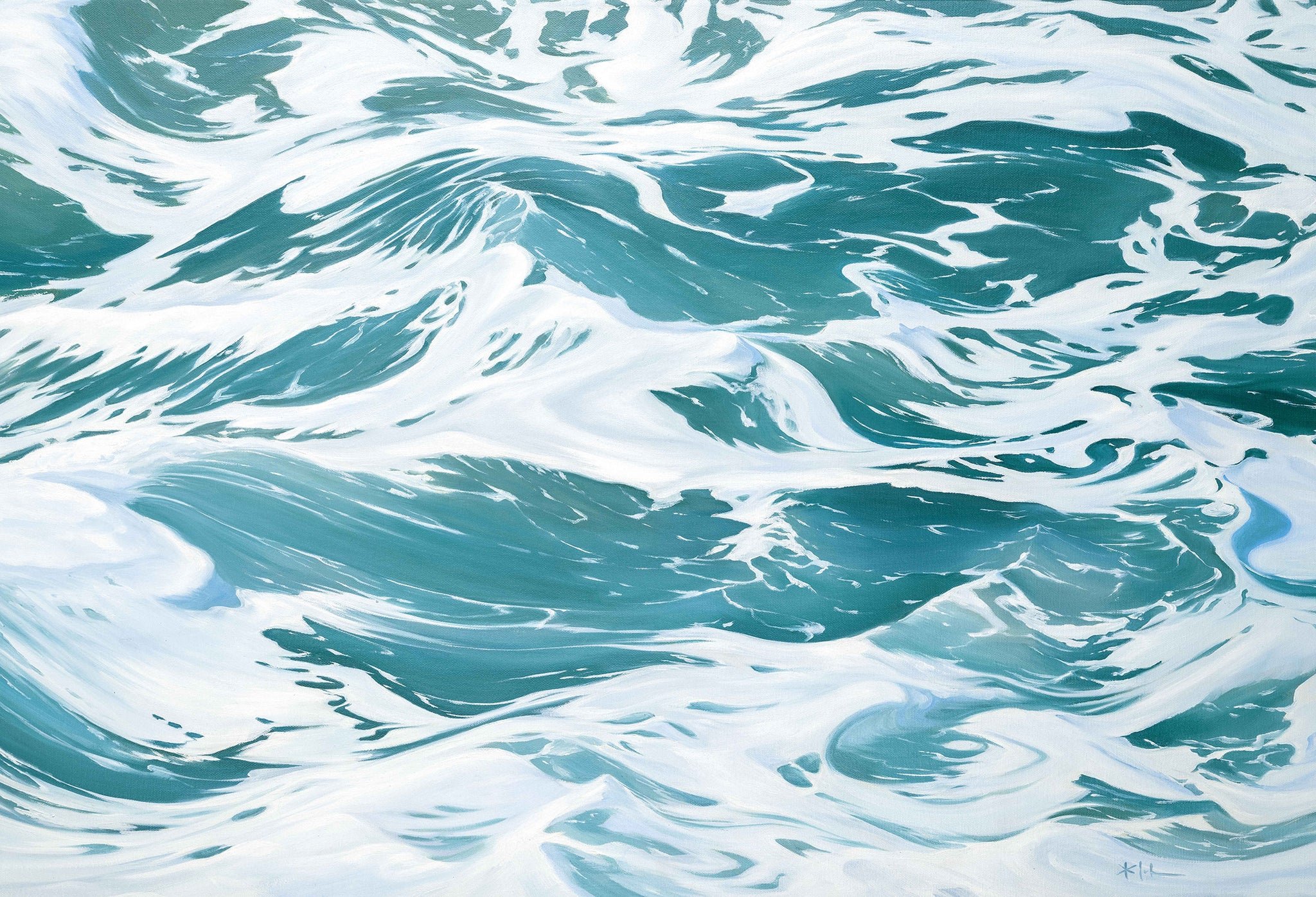 Some common techniques used to depict the ocean in art include blending colors to create realistic water textures, using light and shadow to convey depth and movement, and employing various brush strokes to mimic the fluidity of water currents.
